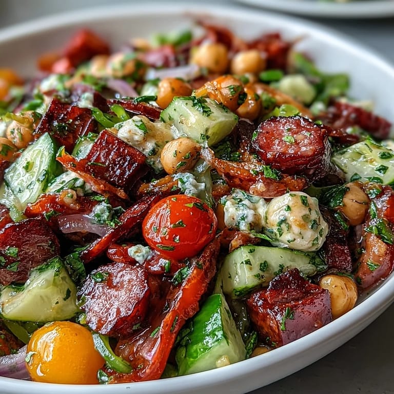 Save My neighbor Maria showed up at my door one summer afternoon with a container of this exact salad, still dripping with dressing, and I devoured it standing at my kitchen counter without even plating it properly. She laughed and said it was her go-to when she wanted something that felt like a feast but didn't require turning on the stove. That one bowl changed how I thought about salads—suddenly they weren't sad desk lunches but actually something I craved.